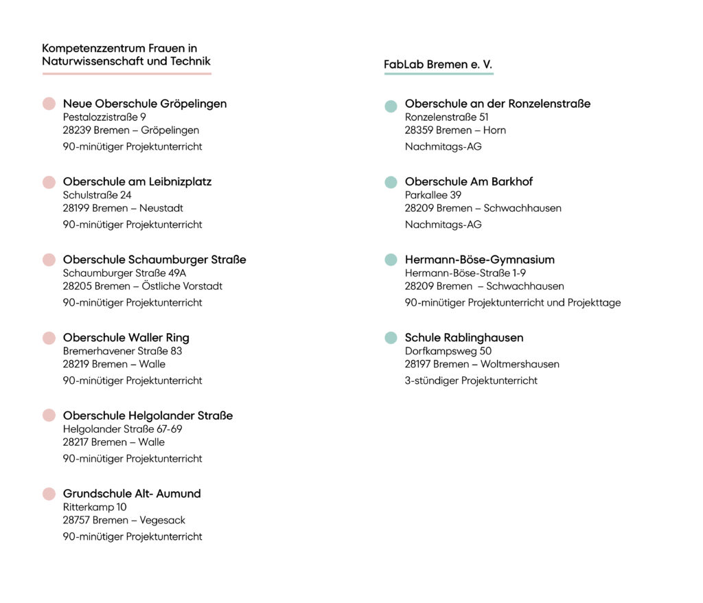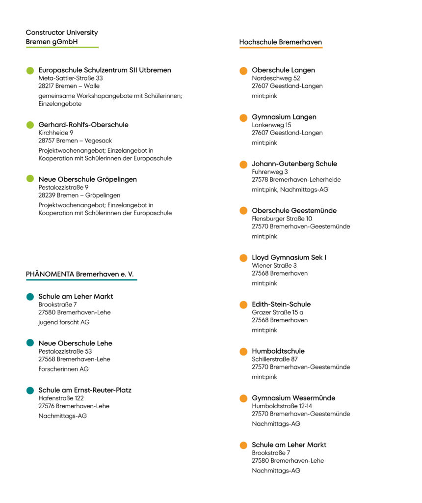 Schulen sind zentrale Partner*innen im Cluster MINTsteps. Unser Ziel ist es, Mädchen und junge Frauen über den Unterricht hinaus Räume für praktische Erfahrungen und eigenes Erforschen zu ermöglichen. Deshalb kooperieren wir direkt mit Schulen in der Region Bremen und Bremerhaven: